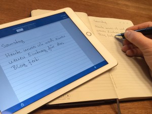 Einen anderen Weg gehen Stifte, mit denen man auf einem Block schreiben kann. Der Stift merkt sich die Bewegungen und zeichnet diese in einem internen Speicher auf. Mit einer App lassen sich die Aufzeichnungen dann auf das Tablet übertragen. Dafür wird entweder Spezialpapier benötigt oder man muss einen kleinen optischen Empfänger an sein Papier klipsen.