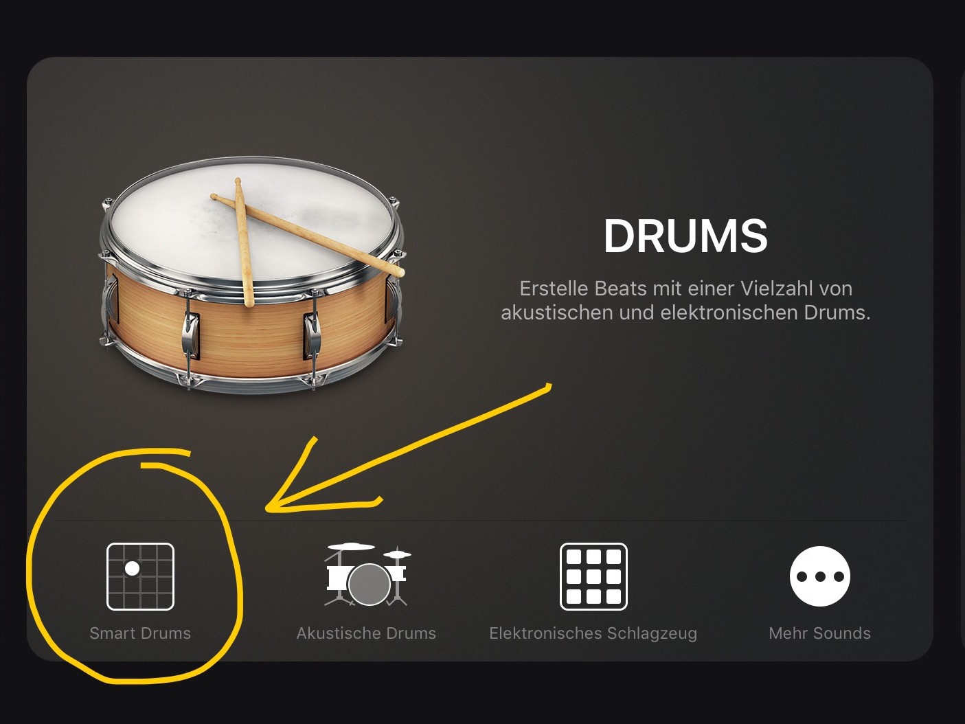 Jetzt ist es an der Zeit ein weiteres Instrument auszusuchen. Ein Schlagzeug würde sich anbieten. Dazu drückt man links unten auf das + Zeichen und kommt so wieder in das Instrumentenkarusell. Hier sucht man nach den „Smart Drums“. Dann zieht man die gewünschten Rhythmusinstrumente in das Raster. Je weiter oben ein Instrument steht, desto lauter ist es, je weiter rechts es steht, desto komplexere Rhythmen und öfter spielt das Instrument.