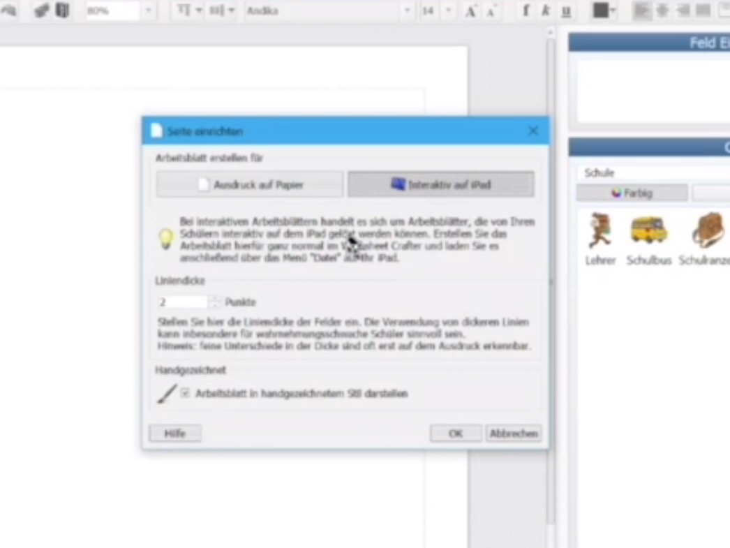Zunächst öffnet man auf dem Mac oder PC die Software „Worksheet Crafter“. Im Menü „Datei – Seite einrichten“ wählt man die Option für die interaktiven iPad Übungen.