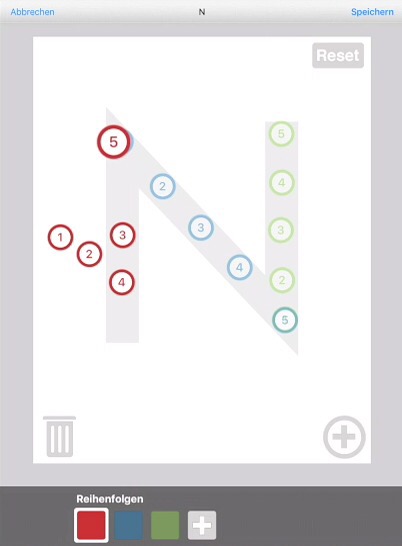 Dazu ruft man, nachdem man das Spiel gestartet hat, die Einstellungen über das Zahnrad rechts oben auf. Man wählt „Einstellungen Trace it Game“. In diesen Setting steht: „Punktierung individuell anpassen“. In diesem Fall wählt man „Letters“ und dann das große „N“. Es erscheint ein Grundriss des Buchstaben. Die Schreibbewegung wird mit Punktendargestellt, die Zahlen stehen für die Reihenfolge, die Farben rot, blau und grün für den Ablauf. Hier können wir die roten Punkte nun einfach mit dem Finger in die richtige Reihenfolge von unten nach oben ziehen.