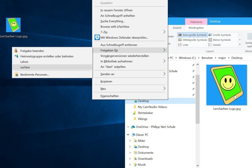 Mit diesem Wissen möchte ich eine Netzwerkfreigabe für den Desktop einrichten. Dazu öffne ich den Windows Explorer und navigiere zum Desktop. Ich wähle den Ordner mit der rechten Maustaste an und gehe zum Menüpunkt „Freigeben für“.