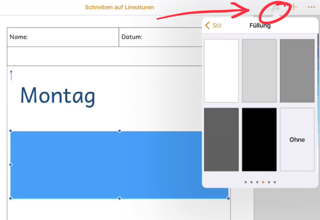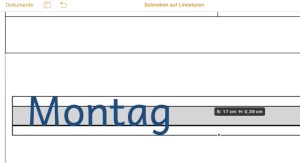 Über das Pinselsymbol muss man jetzt die Linetaurgruppe und das Textfeld in der Position zueinander anordnen, also das Textfeld ganz nach oben, die Lineatur ganz nach unten. Man schiebt das Textfeld passend auf die Grundlinie. Jetzt muss man die Abstände der Linien noch auf die Schrift anpassen. Dazu tippt man doppelt auf die Gruppe und kann die Rechtecke wieder einzeln anwählen und die Größe durch Ziehen so verändern, dass es zur Schrift passt.
