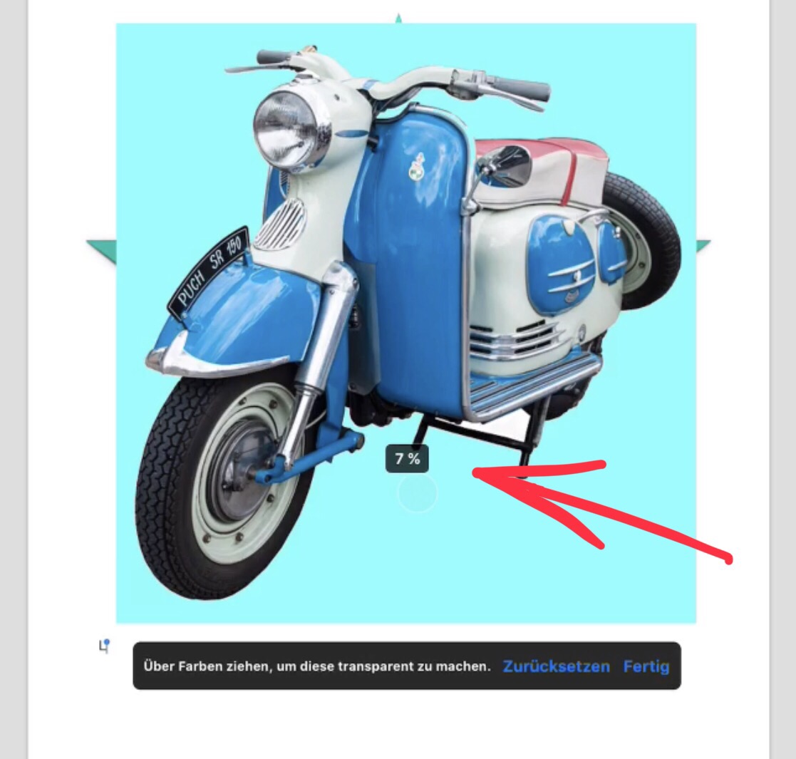 Hier füge ich das Bild in ein Blatt ein. Mit dem Pinsel Symbol rechts oben gelange ich zu dem Formatierungen. Unter dem Menüpunkt „Bild“ findet man die Funktion „Transparenz“.