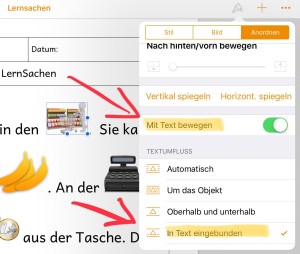 Wenn der Punkt „Mit Text bewegen“ aktiviert ist, lässt sich die Option „in Text eingebunden“ auswählen. Damit verhält sich mein Bild oder Clipart nun wie ein Buchstabe und kann an die entsprechende Stelle im Text geschoben werden und das Wort ersetzen. Das Bild bewegt sich jetzt wie ein getippter Buchstabe mit dem Text mit, wenn zum Beispiel Leerzeichen davor eingegeben werden.