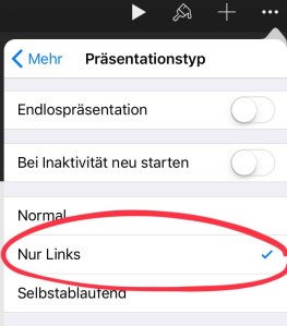 Keynote ist ein Präsentationsprogramm wie PowerPoint. Damit wir interaktive Funktionen einbauen können (Wenn ich etwas drücke soll ein Sound zu hören sein), muss ich zuerst den Präsentationstyp auf „Nur Links“ umstellen.