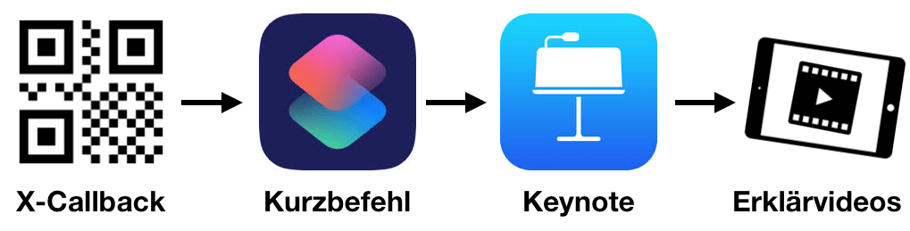 Die X-Callback URL öffnet einen Kurzbefehl, dieser öffnet die Keynote mit dem interaktiven Video und spielt sie sofort ab.