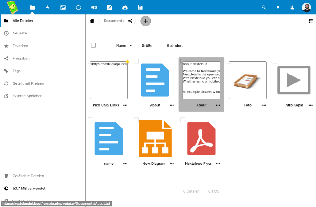 Die Nextcloud ist ein konfigurierbarer Netzwerkspeicher, wie z. B. Dropbox. Nur dass man ihn eben selber betreiben kann und die Dateien auf dem eigenen Server, in diesem Fall auf dem eigenen Raspberry Pi, liegen.