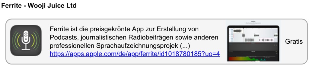 Auf dem iPad empfehlen sich für Audio Aufnahmen die Apps Garageband, Audio Share und Ferrite Studio, wobei letzteres die besten Features zum Nachbearbeiten von Audiomaterial bietet.