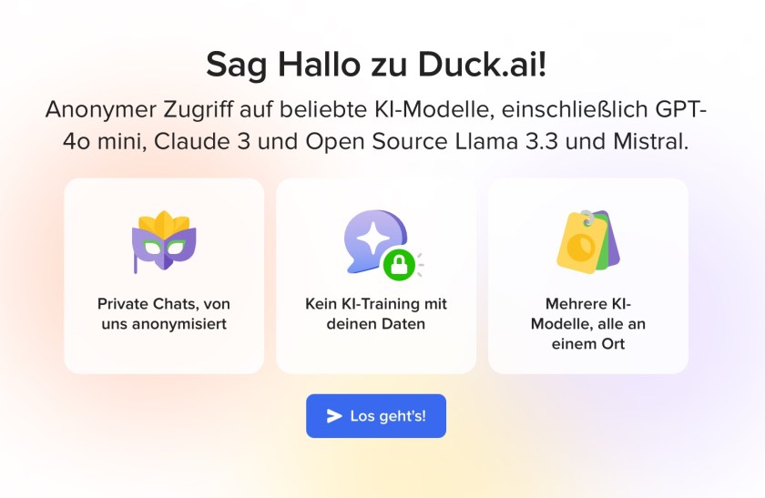 Seit einiger Zeit haben sie auch Duck.ai im Angebot. Ein KI-Chatbot, für den man keine Anmeldung benötigt, keine Gebühren bezahlt und der die eingegeben Daten anonymisiert und vor Weitergabe schützt. Die Daten werden nicht gespeichert und nicht zu Trainingszwecken der KI genutzt.