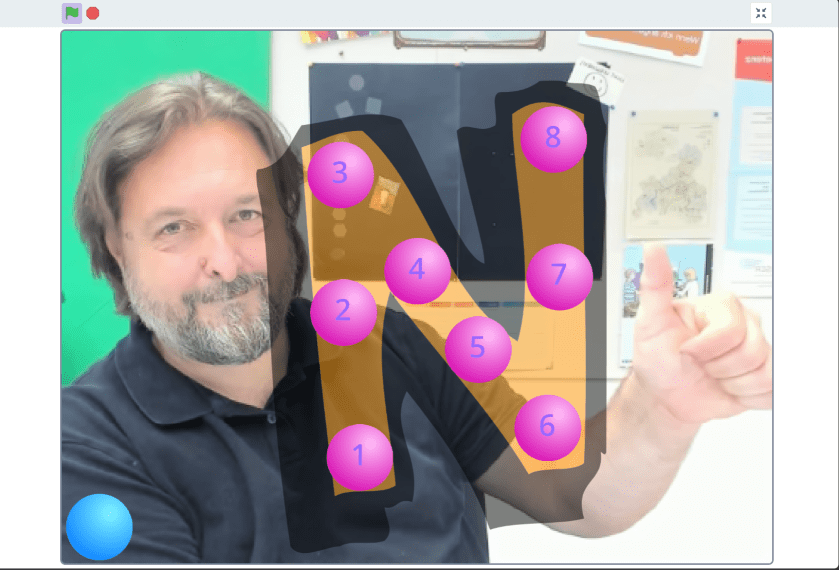 Ein besonders anschauliches Beispiel für den Unterrichtseinsatz ist die Nasen-Schreib-Übung: Ein blauer Ball folgt der Nase der Person vor der Kamera. Auf dem Bildschirm sind Kugeln in Buchstabenform angeordnet, die nacheinander mit dem nasengesteuerten Ball berührt werden müssen. Diese Übung demonstriert auf spielerische Weise, wie KI Gesichtserkennung funktioniert und macht abstrakte Konzepte konkret erfahrbar.